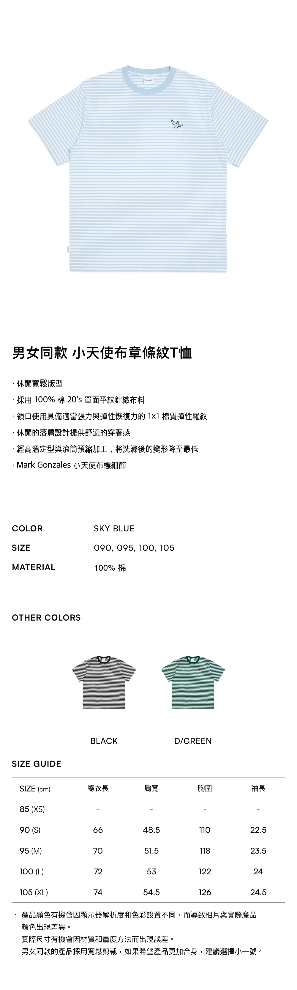 - 採用 100% 棉 20's 單面平紋針織布料