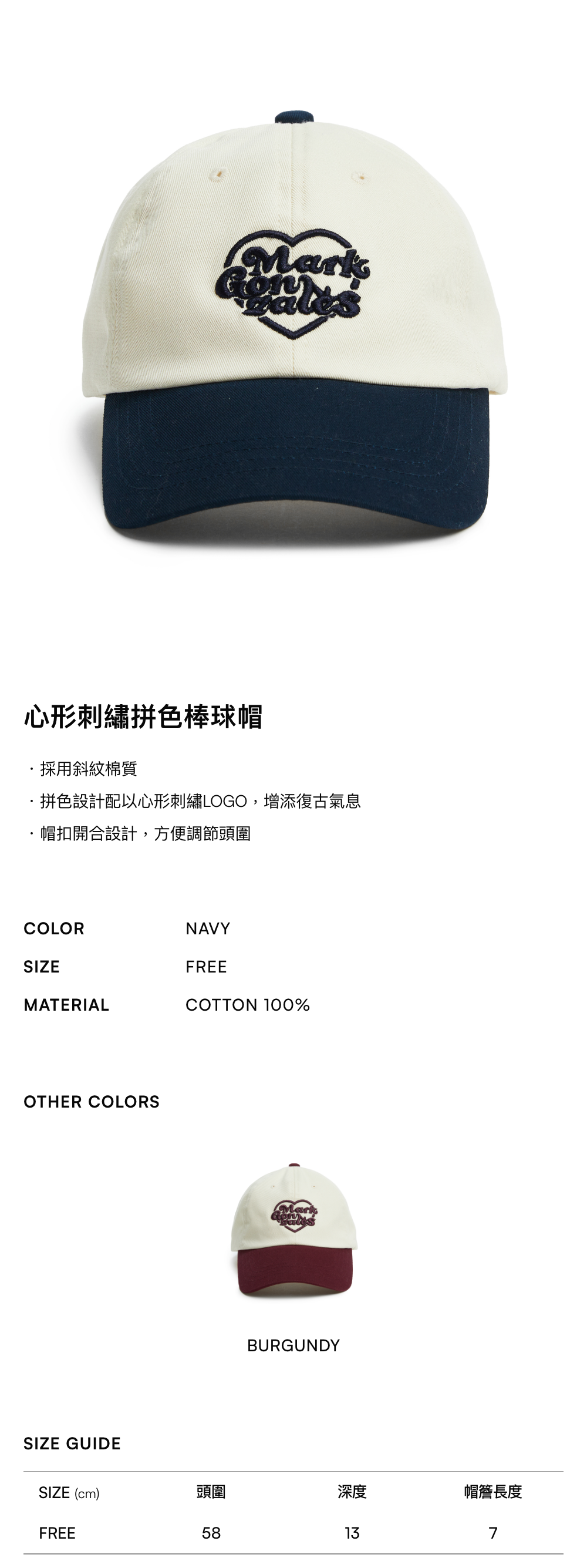 - 拚色設計配以心型刺繡LOGO,添加復古氣息