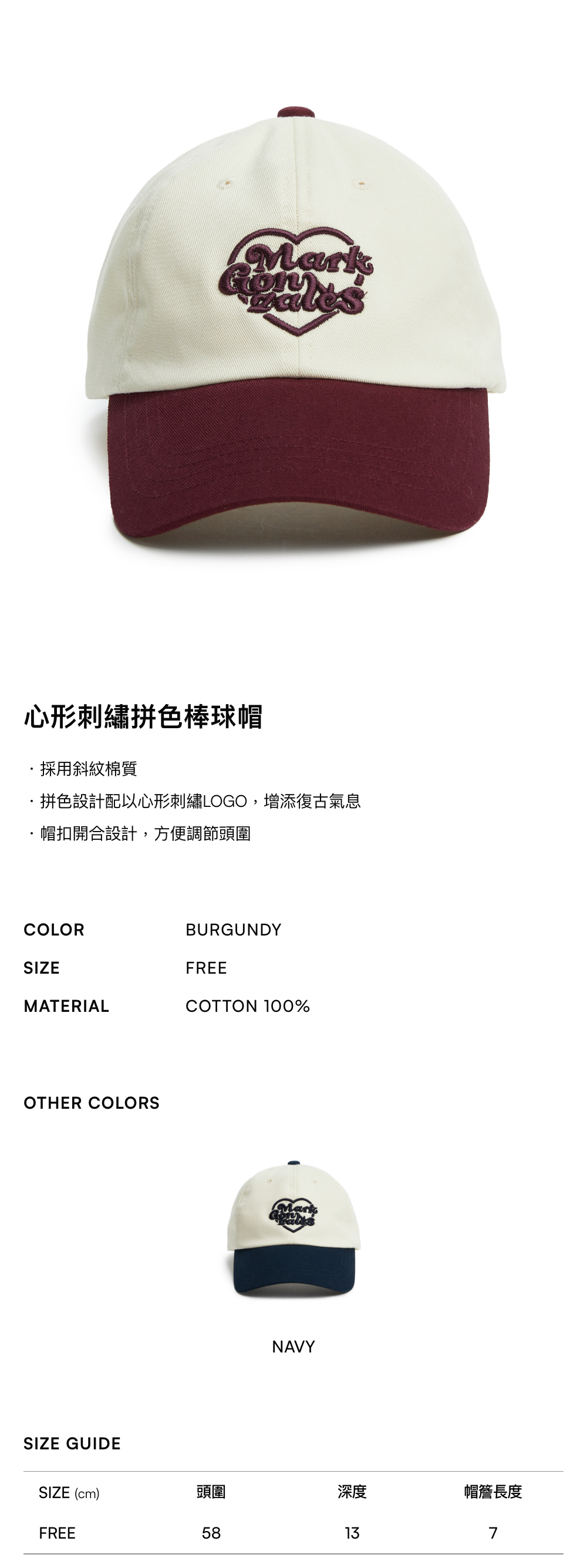 - 拚色設計配以心型刺繡LOGO,添加復古氣息