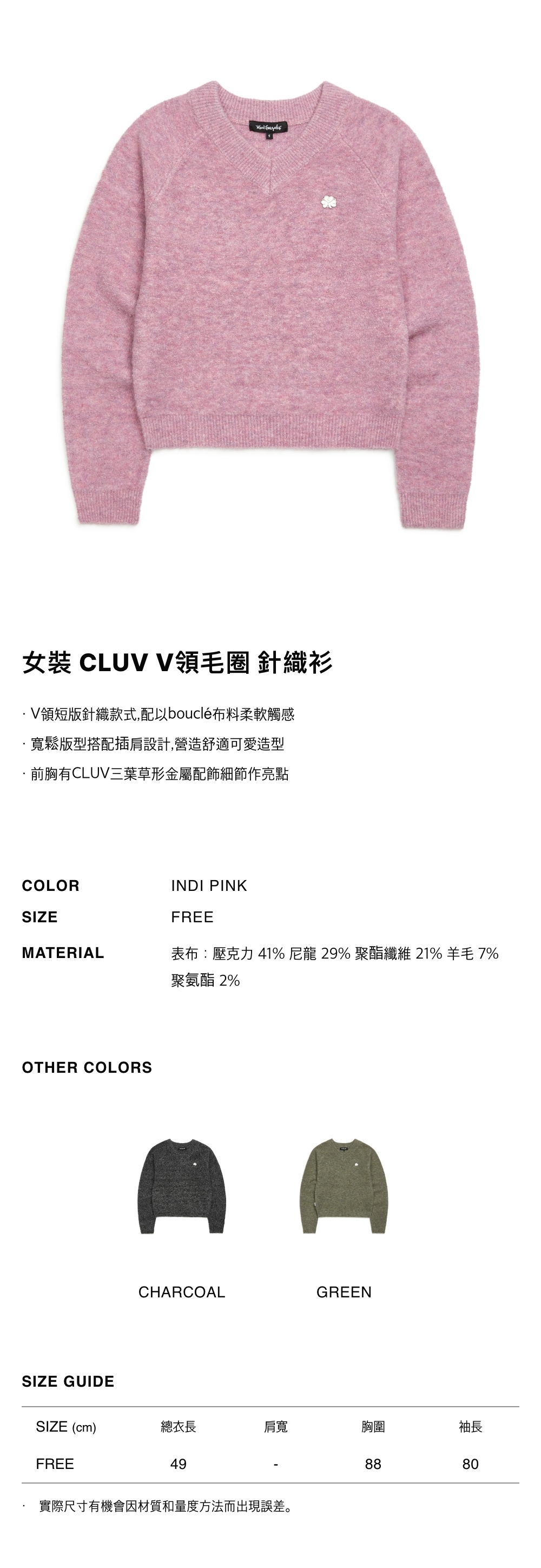 - 前胸有CLUV三葉草形金屬配飾細節作亮點