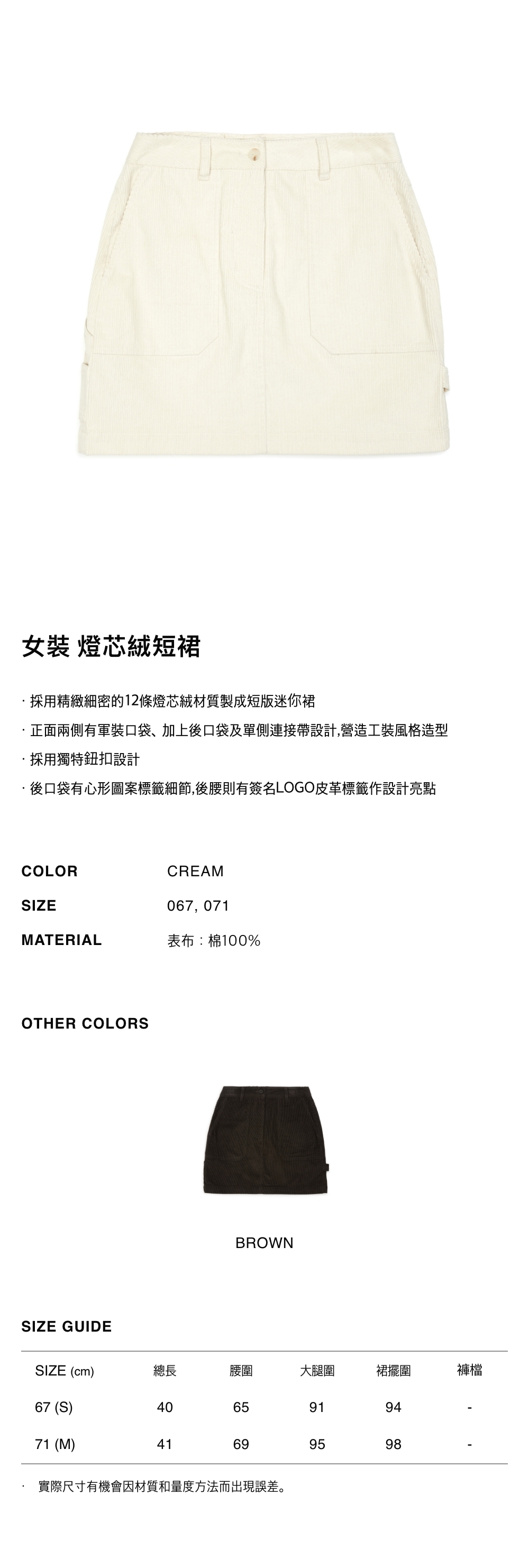 - 採用精緻細密的12條燈芯絨材質製成短版迷你裙