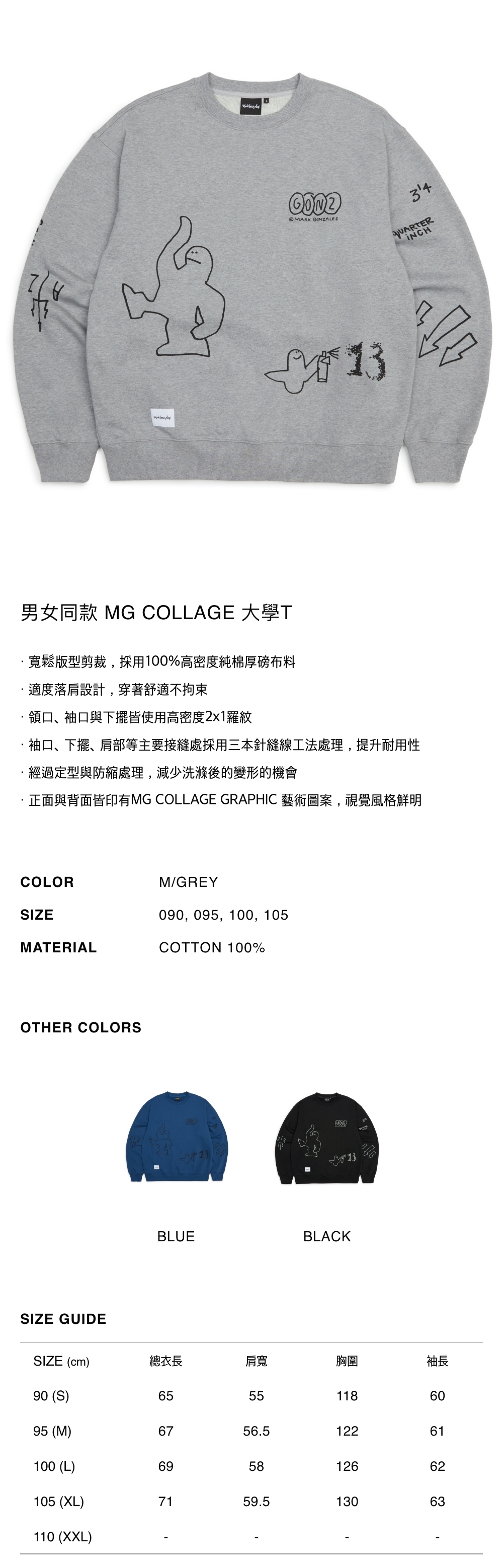 - 正面與背面皆印有MG COLLAGE GRAPHIC 藝術圖案,視覺風格鮮明
