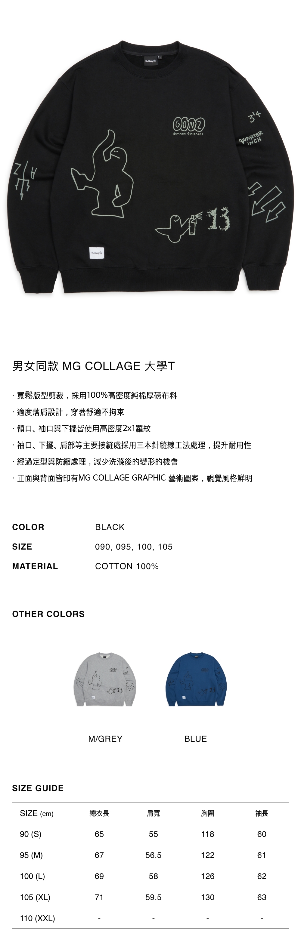- 正面與背面皆印有MG COLLAGE GRAPHIC 藝術圖案,視覺風格鮮明