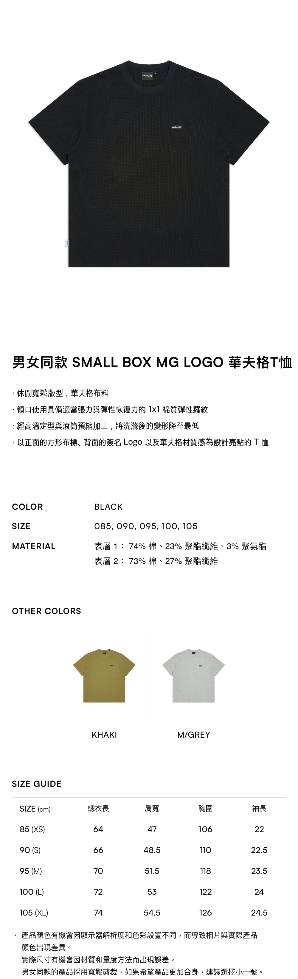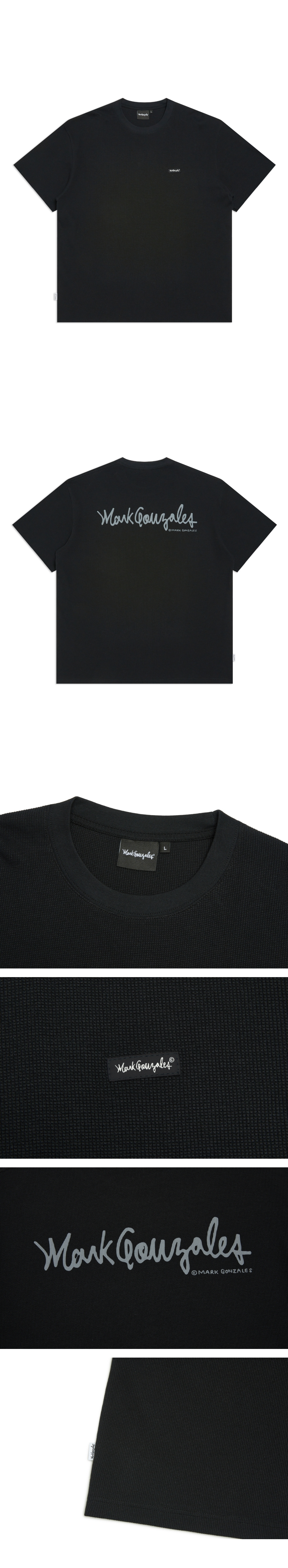 - 以正面的方形布標、背面的簽名 Logo 以及華夫格材質感為設計亮點的 T 恤