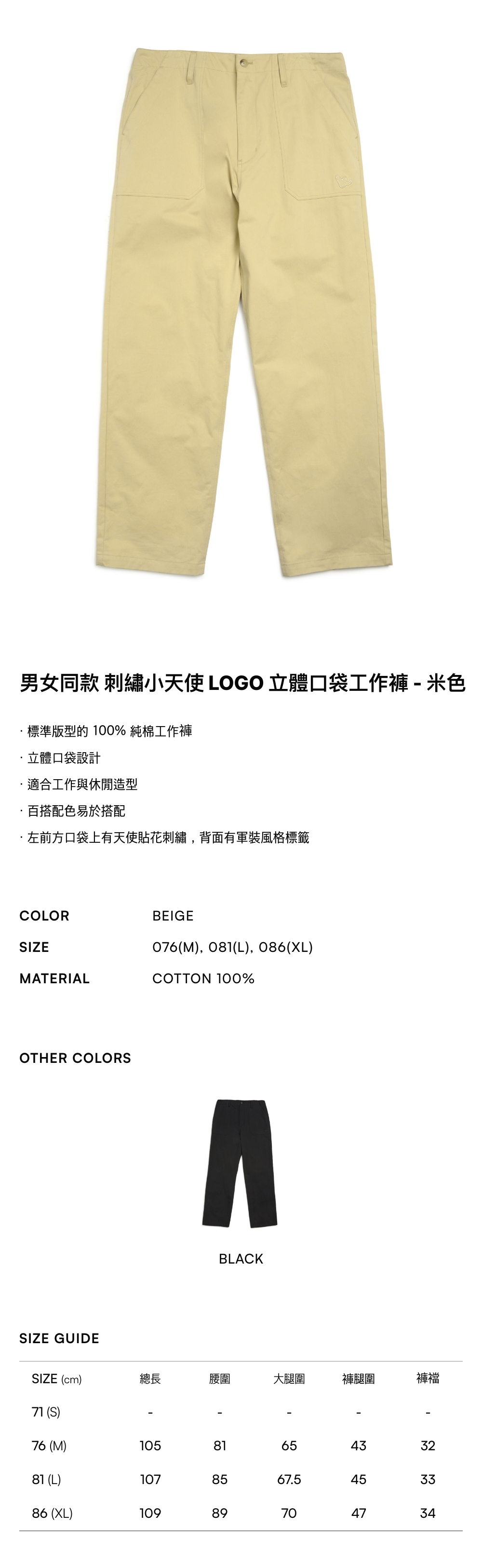 - 左前方口袋上有天使貼花刺繡,背面有軍裝風格標籤