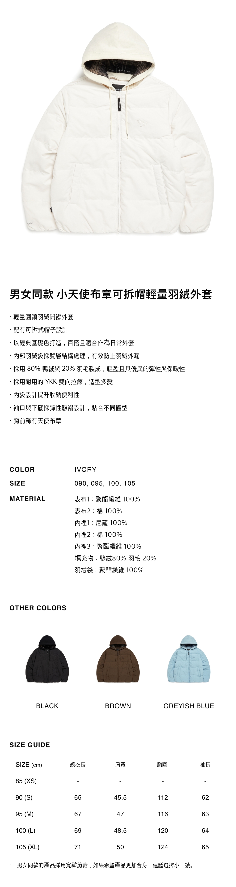 - 採用 80% 鴨絨與 20% 羽毛製成,輕盈且具優異的彈性與保暖性
