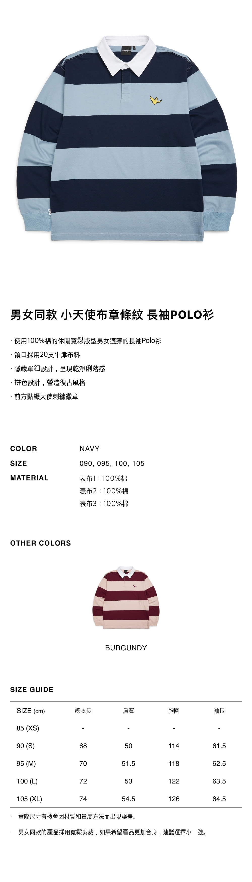 - 使用100%棉的休閒寬鬆版型男女適穿的長袖Polo衫