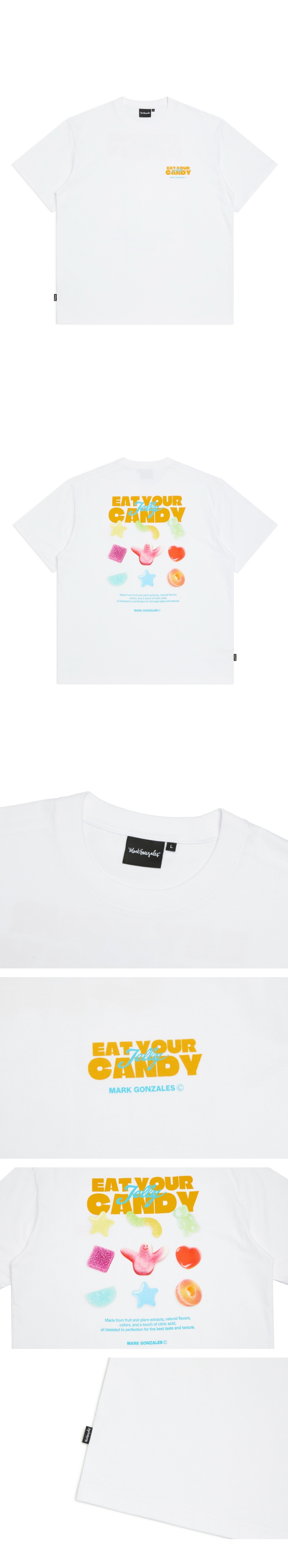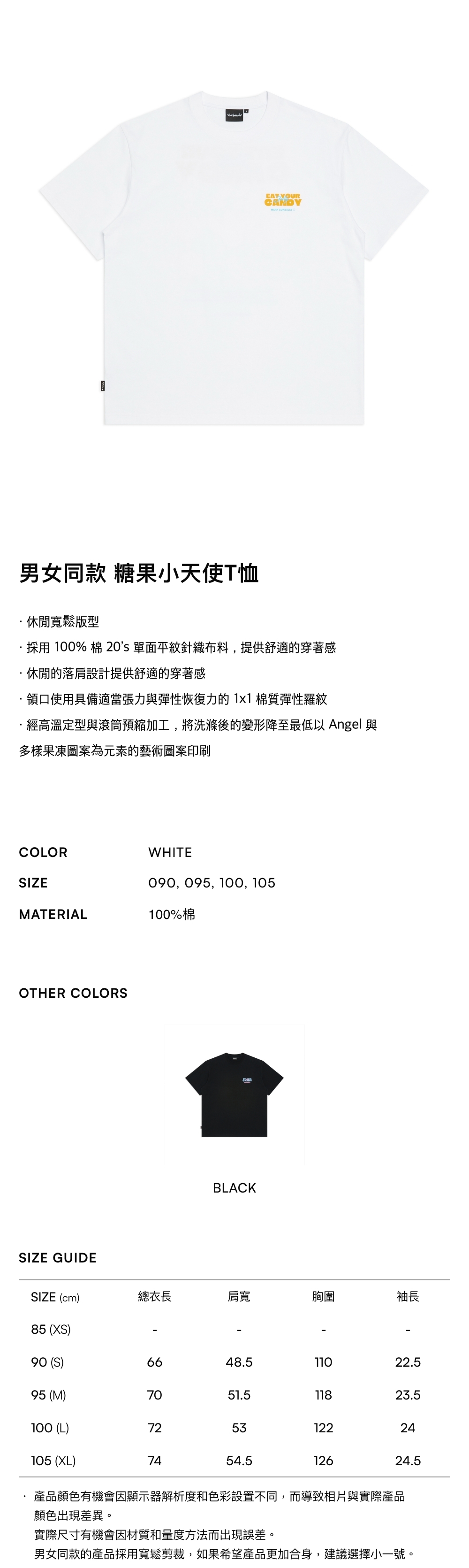 - 經高溫定型與滾筒預縮加工,將洗滌後的變形降至最低以 Angel 與多樣果凍圖案為元素的藝術圖案印刷