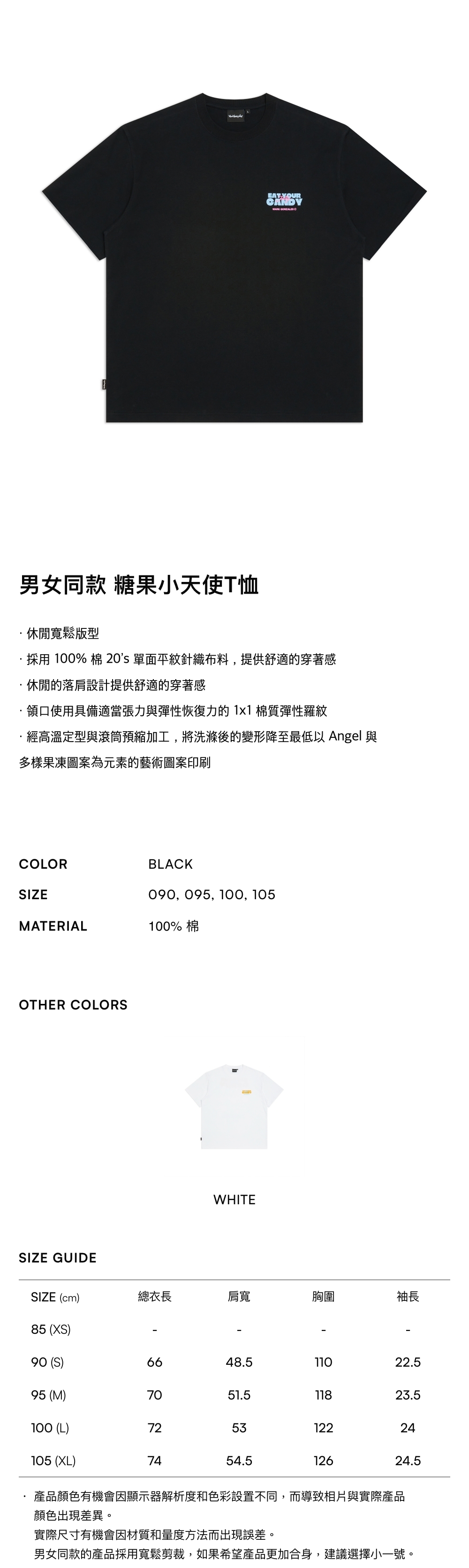 - 經高溫定型與滾筒預縮加工,將洗滌後的變形降至最低以 Angel 與多樣果凍圖案為元素的藝術圖案印刷