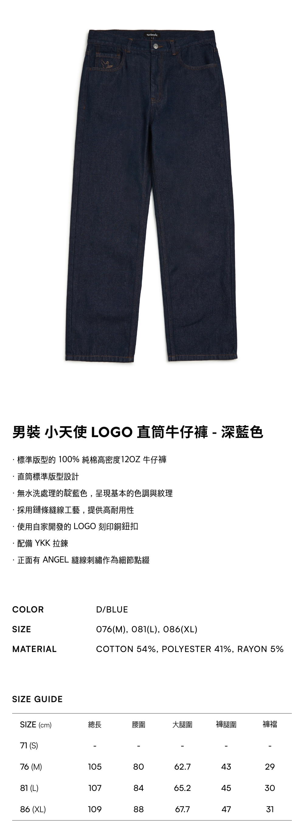 - 標準版型的100%純棉高密度12OZ牛仔褲
