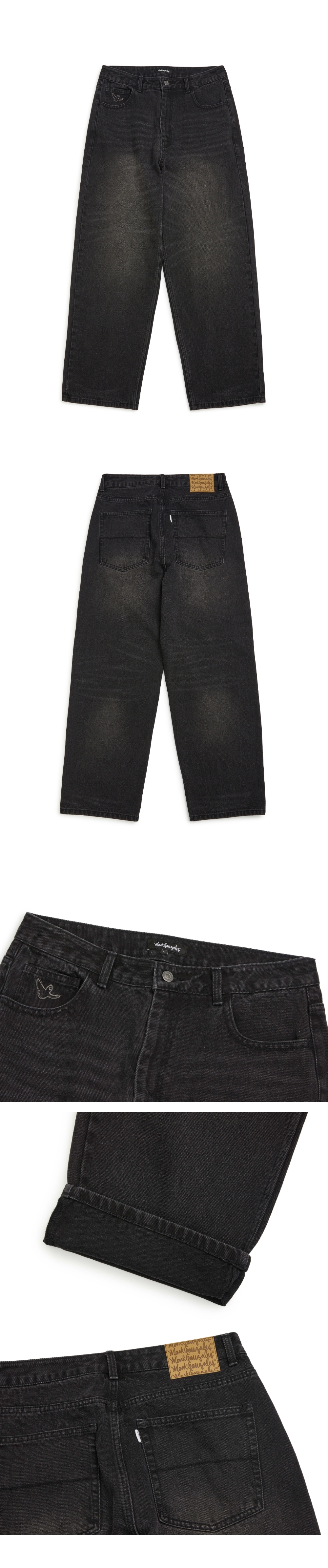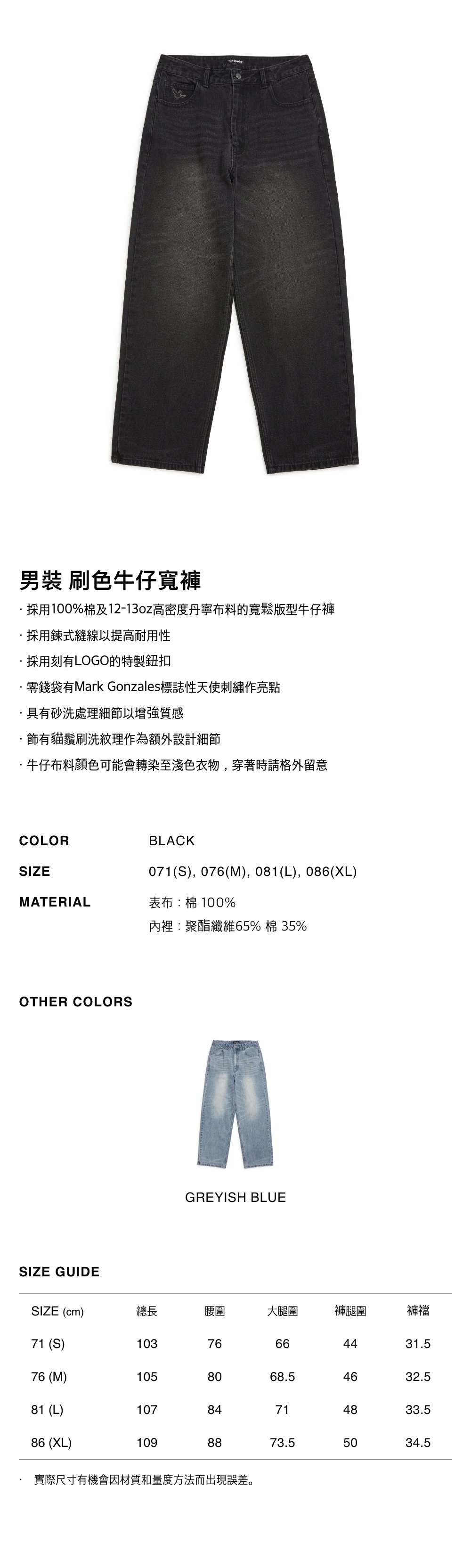 - 採用100%棉及12-13oz高密度丹寧布料的寬鬆版型牛仔褲